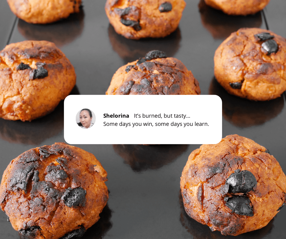 I set my timer for 10 minutes. Turns out it’s too long. 5 minutes in, I can smell something is burning. I peek in my oven, and yes my cookies are burned. Still edible, but burned.